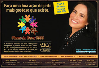 A 1900 Pizzeria promoverá no dia 22 de novembro, mais uma edição da noite filantrópica Pizza do Bem. Durante a ação, a cada pizza grande vendida, R$ 20,00 de seu valor serão convertidos para doações.