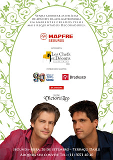Minhas lindas amigas do Projeto Velho Amigo-PVA, projeto este que cuida de vários asilos, pedem para avisar, que a edição 2011 do evento Les Chefs Et Décours, que alia gastronomia e decoração numa festa linda, e o melhor, beneficente, acontecerá este ano no dia 26 de Setembro, como sempre no Terraço Daslu.