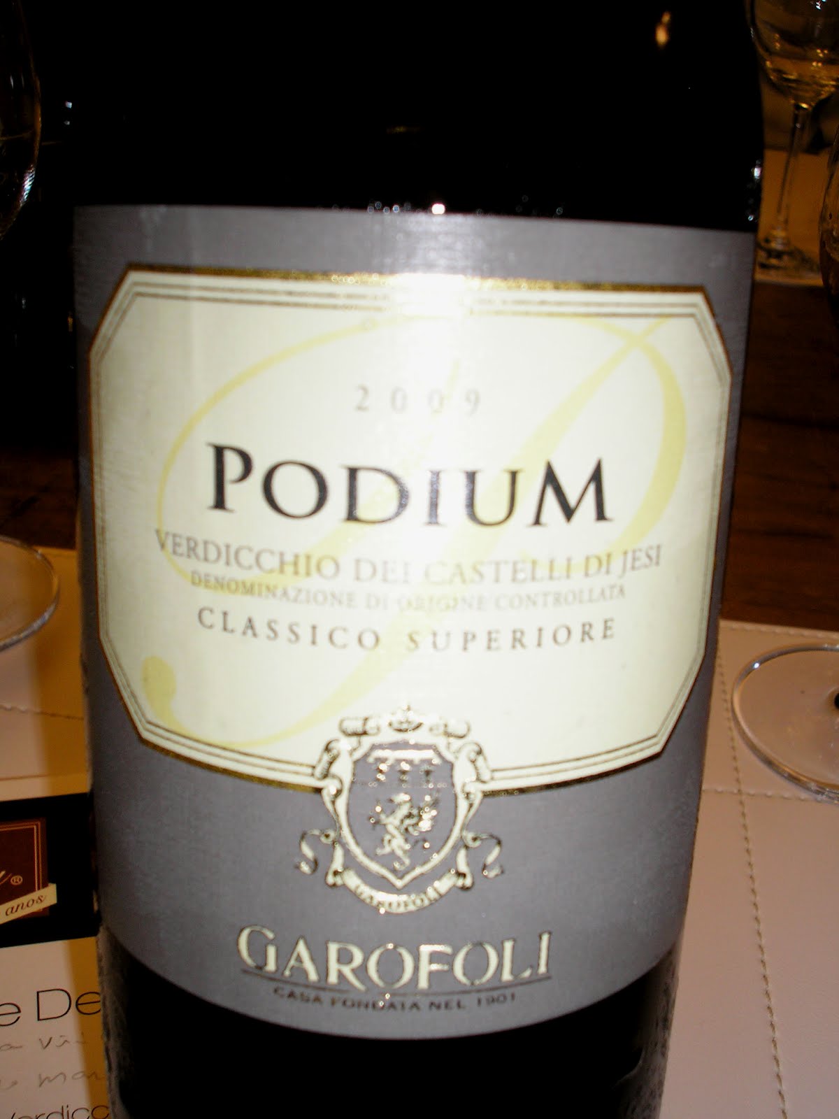Garofoli Podium Verdicchio dei Castelli di Jesi 2009 DOCG, um Clássico Superiore, com 14% de álcool, que muito equilibrado com acidez não incomoda, e só ajuda para harmonizações, este sim, creio, deva ser acompanhado de gastronomia, apesar de que sou da teoria que devamos degustar o que gostamos, com ou sem comidas, ou com elas, mesmo que os compêndios digam que as mesmas não “combinam” com o vinho.