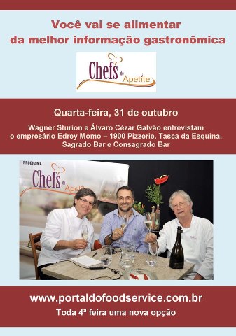 Como já dito antes, o nosso programa(leia-se Wagner Sturion, Ciro Benatti e eu) desta quarta-feira, 31de Outubro, estará disponível amanhã dentro do Portal do Food Service <http://www.portaldofoodservice.com.br/>