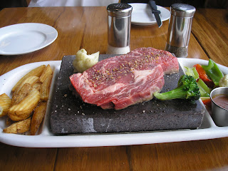 No caso do Stone Grill, a carta de vinhos era muito pobre, então parti para a GIB English Bay Pale Ale, já que iria pedir o Ribeye, que vem cru em cima de uma pedra quentíssima, e você a grelha ali mesmo, no ponto que desejar, acompanhada de batatas fritas e legumes, que também você grelha, também vem um potinho de um molho que lembra um pouco o de tomates com shoyo.