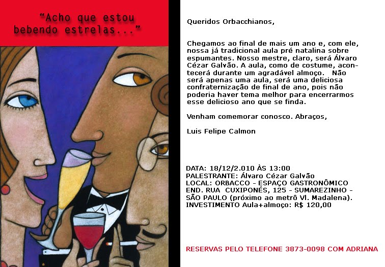 Estamos quase no dia de festejarmos em mais uma palestra sobre espumantes, já tradicional na Orbacco Espaço Gastronômico, local onde também ministro aulas sobre enogastronomia e vinhos, além de almoços e jantares harmonizados.