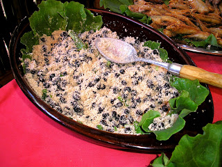 Na foto, a farofa de içás, que são as “bolinhas” pretas do prato.