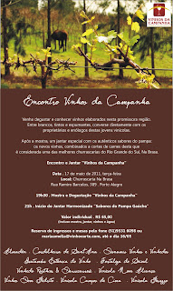 No próximo dia 17 de maio, terça-feira, acontecerá em Porto Alegre a mostra “Vinhos da Campanha”. Organizada pela Associação de Produtores Vinhos da Campanha, o evento visa apresentar todo o potencial desta nova região, através de degustação e exposição. Será a oportunidade de conhecer vinícolas inéditas, provar as novas safras, conversando diretamente com os enólogos e proprietários das mesmas. O local escolhido foi a Churrascaria Na Brasa, uma referência em gastronomia gaúcha, bem condizente com a proposta e identidade da Campanha. Além do clima e paisagem, outro diferencial da Campanha Gaúcha é a forte presença de jovens no comando das empresas e elaboração dos vinhos, onde tecnologia, marketing e expressão dos aspectos regionais tem sido as prioridades. O evento consta de três partes, sendo uma palestra sobre a região, voltada a profissionais, seguido da mostra e degustação, finalizando com jantar. Estarão no evento vinícolas das cidades de Dom Pedrito, Itaqui, Santana do Livramento, Bagé, Candiota e Rosário do Sul. A promoção é da Associação Vinhos da Campanha, com a realização da Vinho e Arte Eventos.