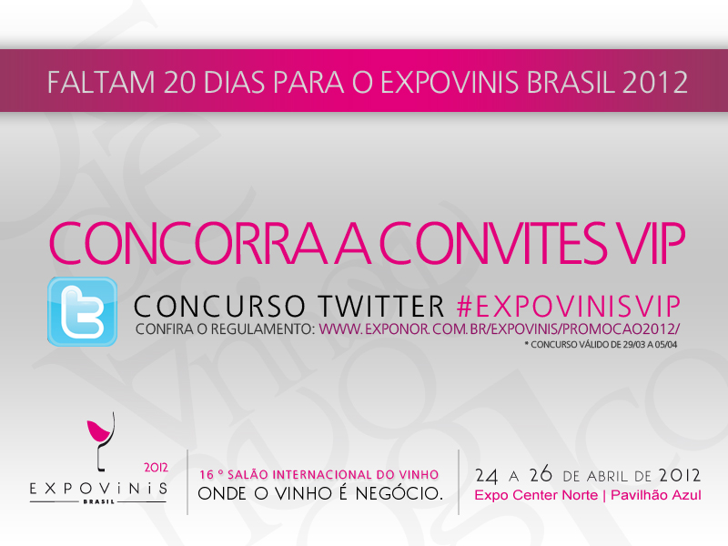 Consolidado como o maior evento do setor de Vinho das Américas, o ExpoVinis Brasil – 16º Salão Internacional do Vinho será realizado entre os dias 24 e 26 de abril, no Expo Center Norte, em São Paulo. A feira contará com participações importantes do setor no cenário nacional e internacional, cerca de 20 mil visitantes, entre proprietários e compradores de bares, restaurantes, hotéis, adegas especializadas, supermercadistas, atacadistas e distribuidores, formadores de opinião, sommeliers, enólogos e enófilos.