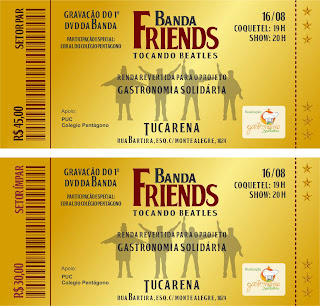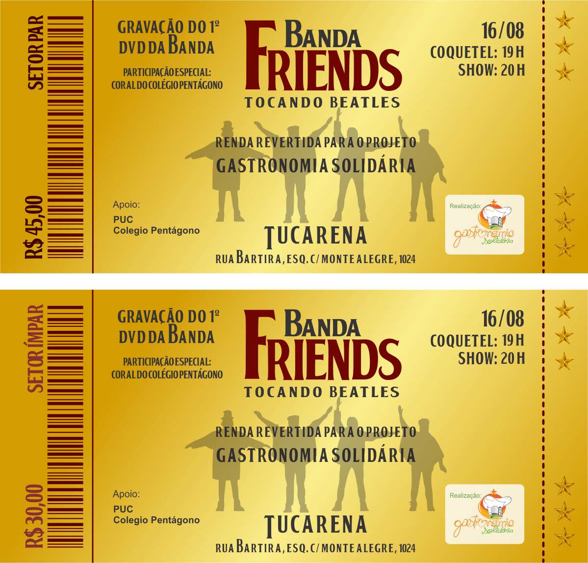 Agora para divulgar show da banda Friends, que será realizado dia 16 de Agosto, no Tucarena, Rua Bartira esquina com Monte Alegre, 1024, e que terá a renda da gravação do CD e do show, revertida para o Projeto Gastronomia Solidária.
