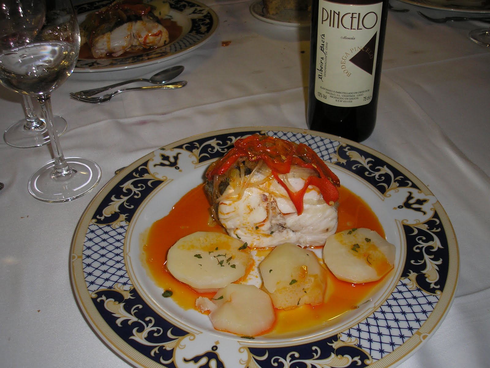 A foto é do antepenúltimo terceiro prato, uma posta de Merluza à Galega, e o vinho é o Pincelo 2009, da Bodega Pincelo, do querido amigo Don Alfonso, da uva Mencia, como todos os tintos, co 12,5% de álcool, com acidez bem marcada, alíás, típica dos vinhos desta denominação de origem, e muita fruta.
