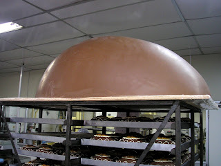 Na foto tirada na Ofner, vemos uma metade do ovo de 175 Kg na prateleira, esperando sua outra metade e o recheio, para posterior embalagem.