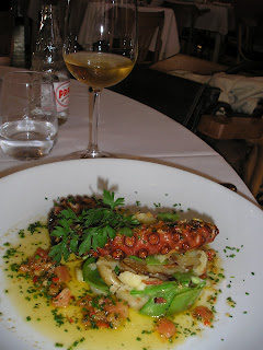 As lulas estavam macias, no ponto, nada daquelas “borrachinhas” que as fazem perder o glamour, e o polvo, macio, carnudo, crocante, saboroso, muito bem combinado com o vinagrete, à cama de batatas, fora o tostado dos baicons que o vinho agradeceu.