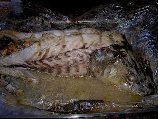 Complexa? Também achei, então os pratos que criei, e modéstia à parte, ficaram ótimos, foi um robalo, aberto pela parte de cima, ou seja, pelas costas, para que eu o recheasse com camarões, feito assado no cartoccio, ao molho de limão cravo, gengibre, pimenta de cheiro e cheiro verde.