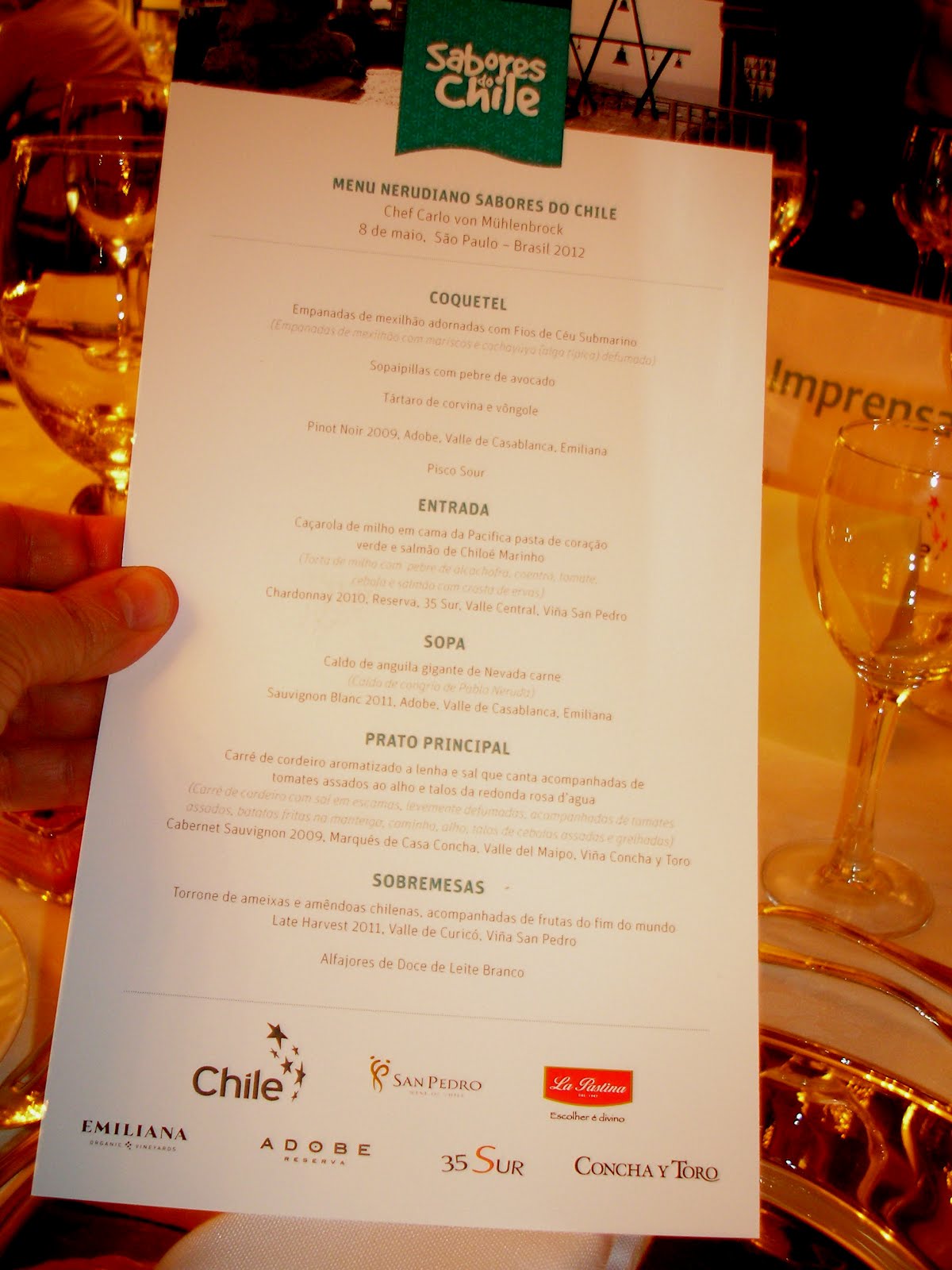 Menu elaborado especialmente para este evento pelo Chef chileno Carlo von Mühlenbrock, onde os produtos Chilenos foram destacados com o tema inspirado em Pablo Neruda.