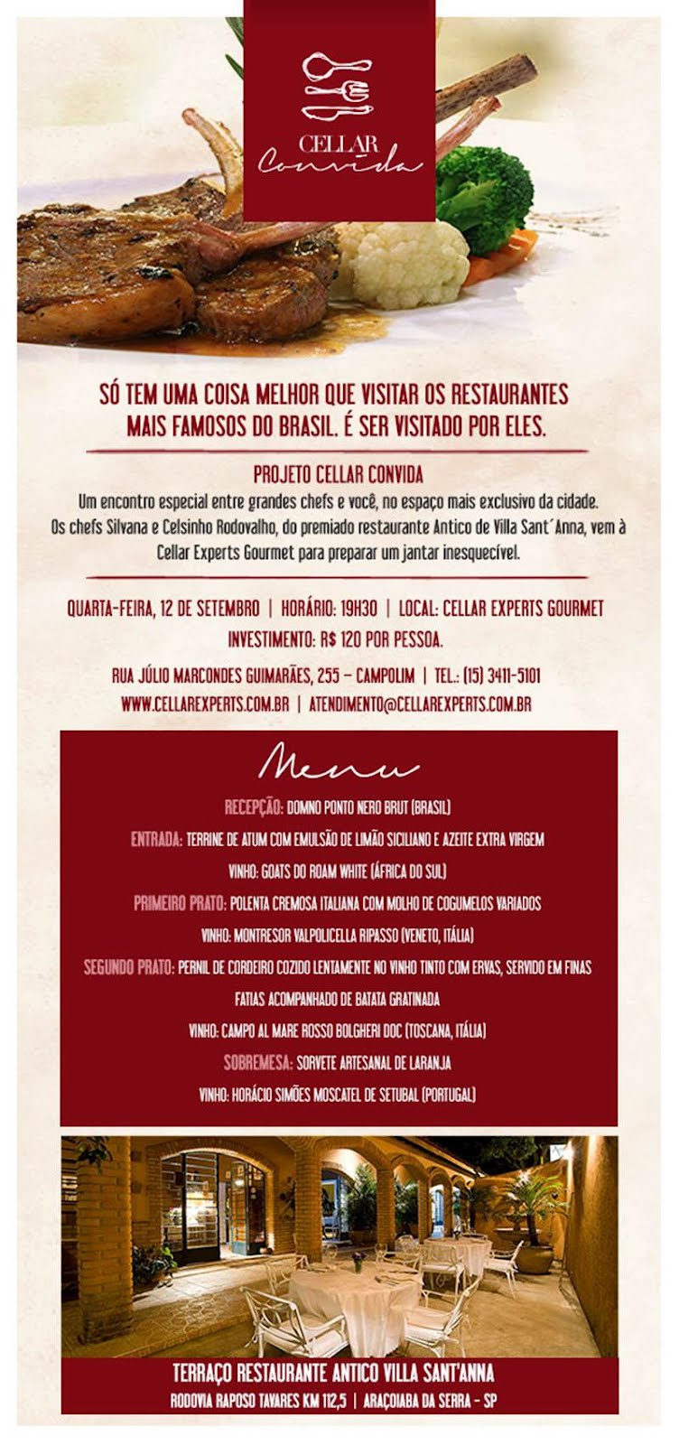 Os chefs Silvana e Celsinho Rodovalho, do restaurante Antico de Villa Sant’Anna, localizado em Araçoiaba da Serra (SP), inauguram o projeto, preparando um jantar surpreendente na Cellar Experts Gourmet, que fica na Rua Júlio Marcondes Guimarães, 255, em frente ao Parque do Campolim, às 19h30.