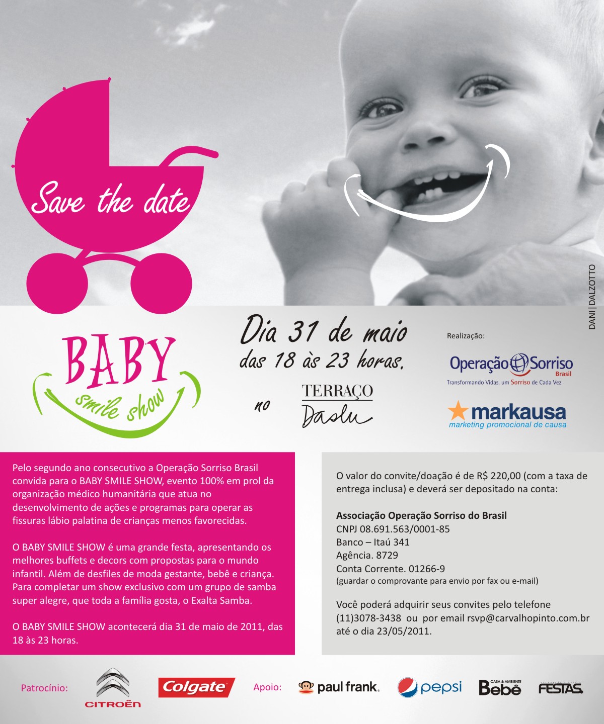 Faz dois anos que a Markausa-Marketing Promocional de Causa, um braço da Markab, da amiga Regina Helou, faz o evento Baby Smile Show, que ocorrerá no Terraço Daslu em 31/05/11, onde a renda é toda revertida em prol do serviço médico humanitário para o tratamento e cirurgias de crianças menos favorecidas, portadoras de fissuras lábio palatinas, o chamado lábio leporino.